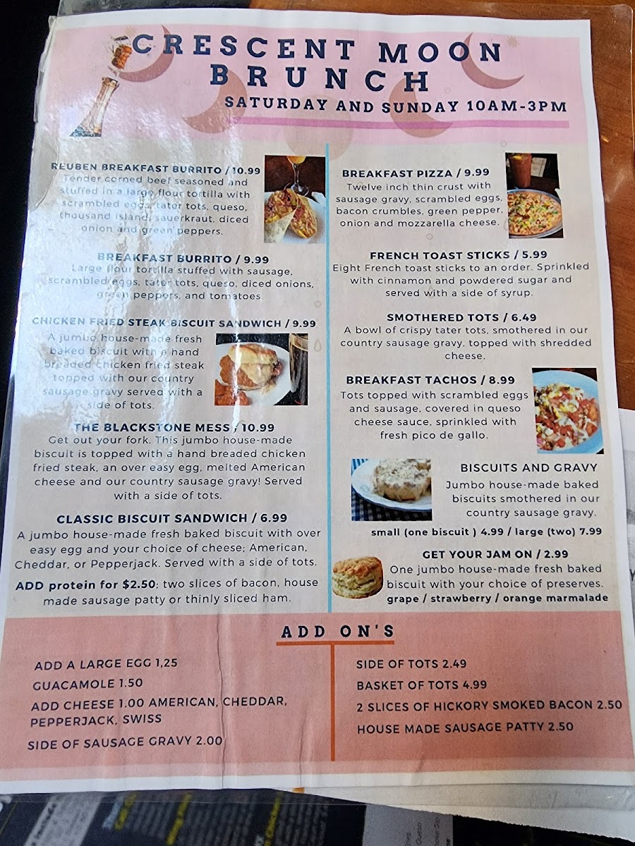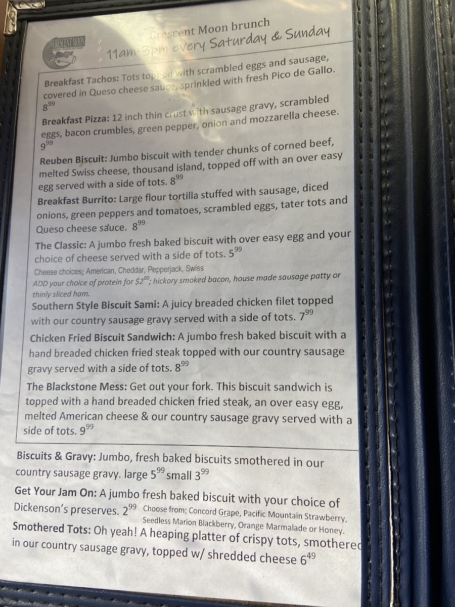 The menu at Crescent Moon offers a variety of mouthwatering options beyond the renowned Reuben. Try the Biscuit and Gravy Platter for a hearty breakfast, or indulge in the flavors of Chicken Fried Steak Platter. If you're feeling adventurous, the Breakfast Totchos—crispy tater tots smothered in a rich blend of toppings—are a must-try for brunch seekers. For those looking for a lighter snack, the Black Forest Ham Melt pairs beautifully with one of their many local beers on tap.
